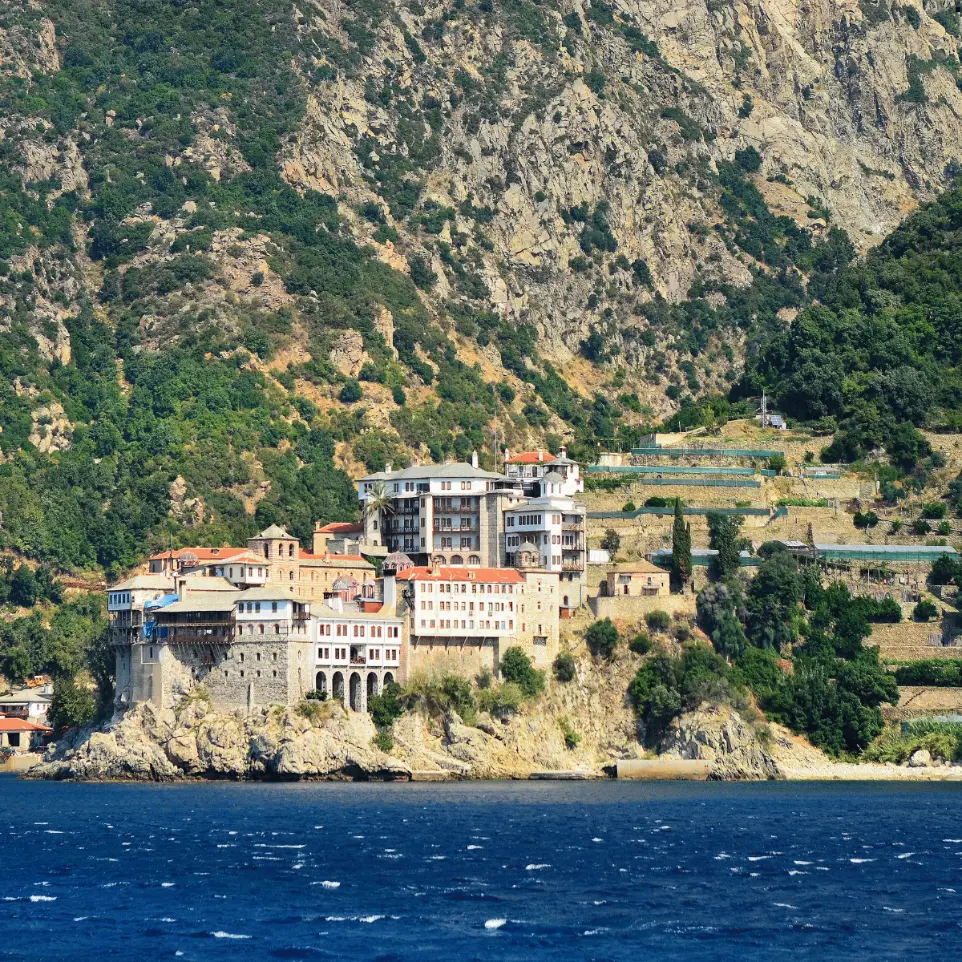Croazieră în jurul Muntelui Athos — vezi mănăstirile de pe coastă, unice în lume, chiar dacă nu poți intra în peninsulă.